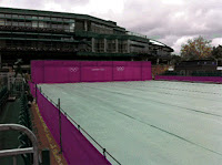 Already, the dark green canvas backstops on the outside courts have been replaced with the purple (looks more like pink to me) brand of London 2012, complete with Olympic rings, while the club's ground staff are busy restoring the lawns after their two-week battering during the rain-hit championships which ended on Sunday.
